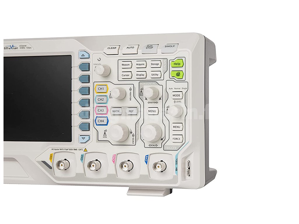 Le Rigol DS1054Z est un oscilloscope à 4 canaux avec un taux d'échantillonnage de 1 GS/s et une mémoire de 12 millions de points. Avec un taux de rafraîchissement de 30 000 wfm/s, il est possible d'analyser rapidement le signal et de détecter tout problème éventuel. Le débit du modèle est divisé par le nombre de canaux actifs, 250 MS/s (4 canaux actifs), 500 MS/s (2 canaux actifs), 1GS/s (1 canal actif). La mémoire de cet appareil est de 24 Mpts répartis entre quatre canaux. L'appareil est équipé d'une interface USB pour le transfert de données vers un PC ou une carte mémoire.Technologie Ultra Vision